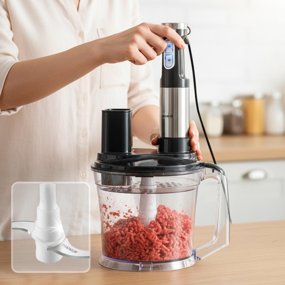 • وظائف متعددة: يفرم، يقطع، يبشر، يخفق البيض، ويخلط السوائل